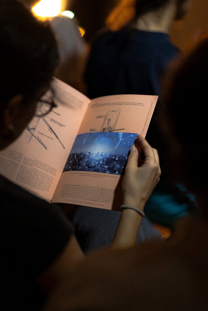 The project was presented at La Parcería. Over the course of five independent sessions, a performative reading was carried out, structured around three axes: the reading of a fictional testimony, the screening of a video, and the distribution of a publication. Developed from conversations with Spanish and Latin American technicians, the project proposes a connection between experiences of technical labor and the personal intersubjectivity tied to migration contexts and working conditions. The video also offers a contemplative view of manual and artisanal labor, highlighting the embodied knowledge and the systematization of gestures that make the continuity of the global network possible.