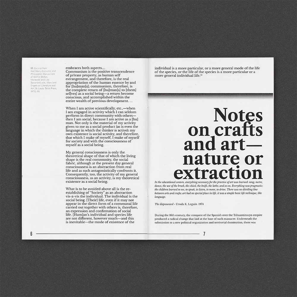 The use of scenography as a resource seeks to present the false and flat backdrop of a constructed reality, as a way of metaphorically thinking about how a specific organization of elements in the world (a context) is conveyed through a form of representation; drawing from the idea of scenography as fiction. On the reverse of these scenic panels are images referring to the aesthetic imagination behind the categorization and rationalization of this pre-Hispanic culture, using archival materials from the MHNN’s informational panels and graphics, together with critical approaches drawing from diverse textual references.